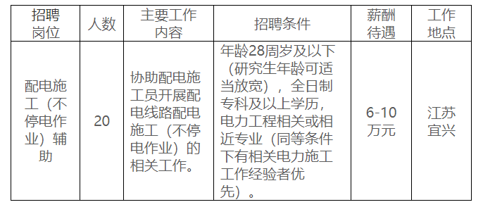 本批次計(jì)劃招聘配電施工(不停電作業(yè))輔助人員20名,具體如下: