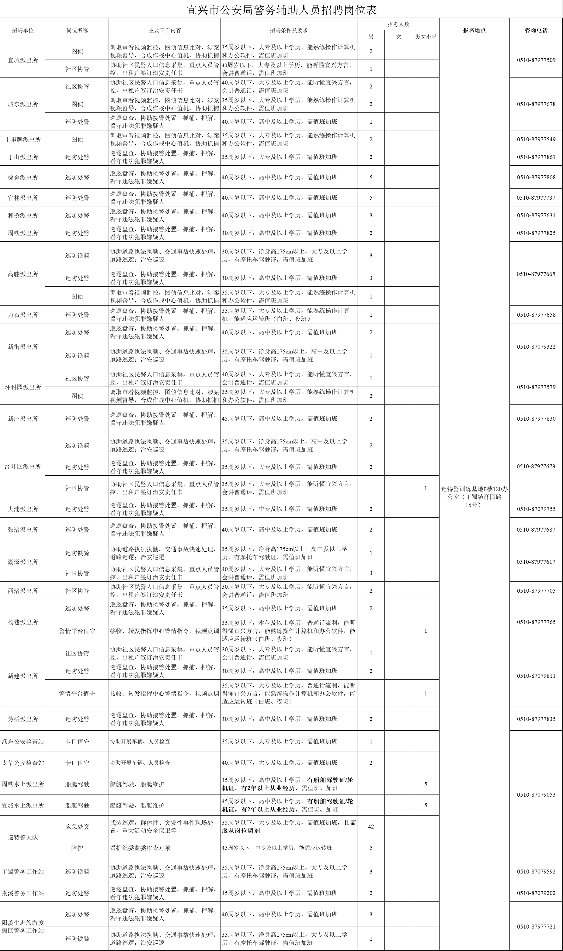 相關(guān)招聘崗位工作內(nèi)容及條件等詳見(jiàn)《宜興市公安局警務(wù)輔助人員招聘崗位表》(附件1)。