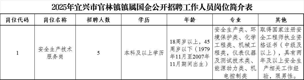 4、具備報考崗位所要求的其他條件,詳見附件1《2025年宜興市官林鎮(zhèn)鎮(zhèn)屬國企公開招聘工作人員崗位簡介表》。