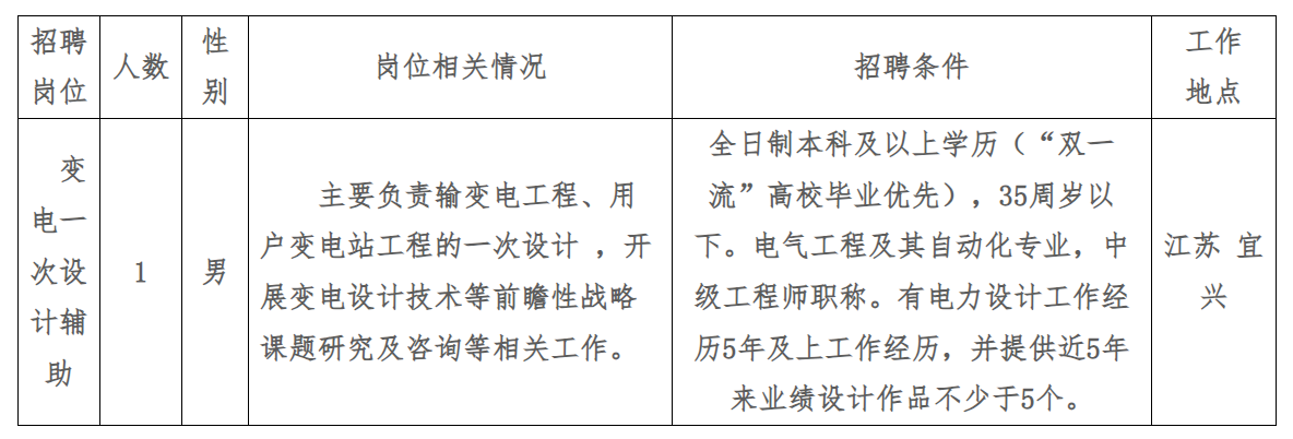 因宜興市宜能實業(yè)有限公司(下稱“宜能實業(yè)”)工作需要,決定面向社會公開招聘變電一次設(shè)計輔助崗位工作人員1名,現(xiàn)將有關(guān)事項公告如下: