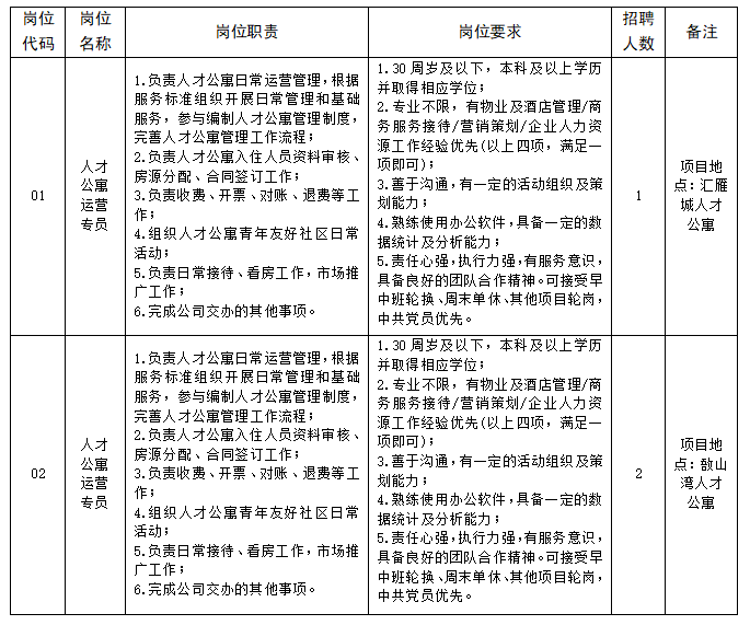 江陰市友唯服務外包有限公司是江陰市人才發(fā)展集團有限公司子公司。人才公寓為集團業(yè)務板塊,是我市為引進各類高層次人才、青年人才和產業(yè)急需緊缺人才提供的周轉性住房,因業(yè)務發(fā)展需要,決定面向社會招聘人才公寓運營管理外包崗位工作人員3名,現(xiàn)將有關事項公告如下: